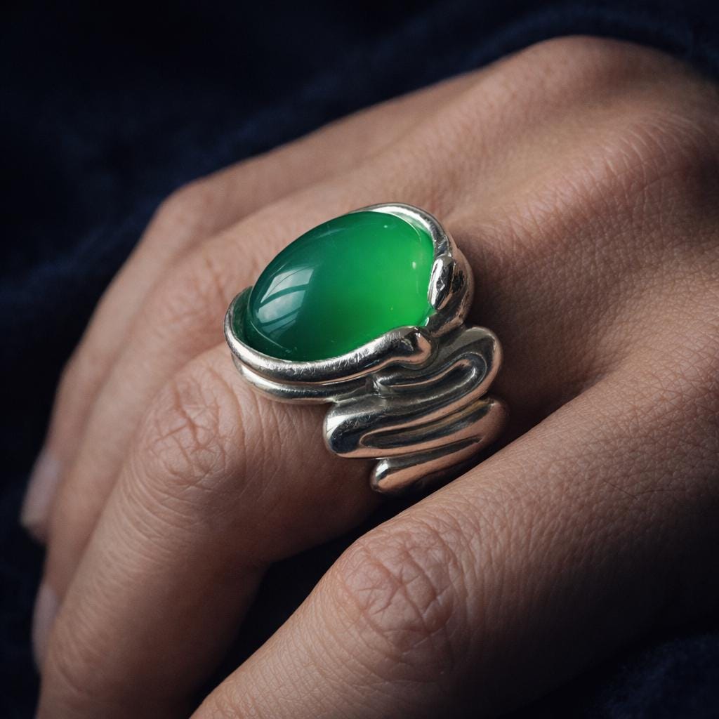 In Greek cosmogony, Eurynome, the Great Primordial Goddess, dances upon the chaos and shapes the universe with the help of the serpent Ophion. From their union emerges the Cosmic Egg, from which the heavens, the earth, and all forms of life are born. Inspired by this ancient legend, this sterling silver ring depicts a serpent coiled around a green agate egg, a symbol of rebirth and connection to cosmic forces.