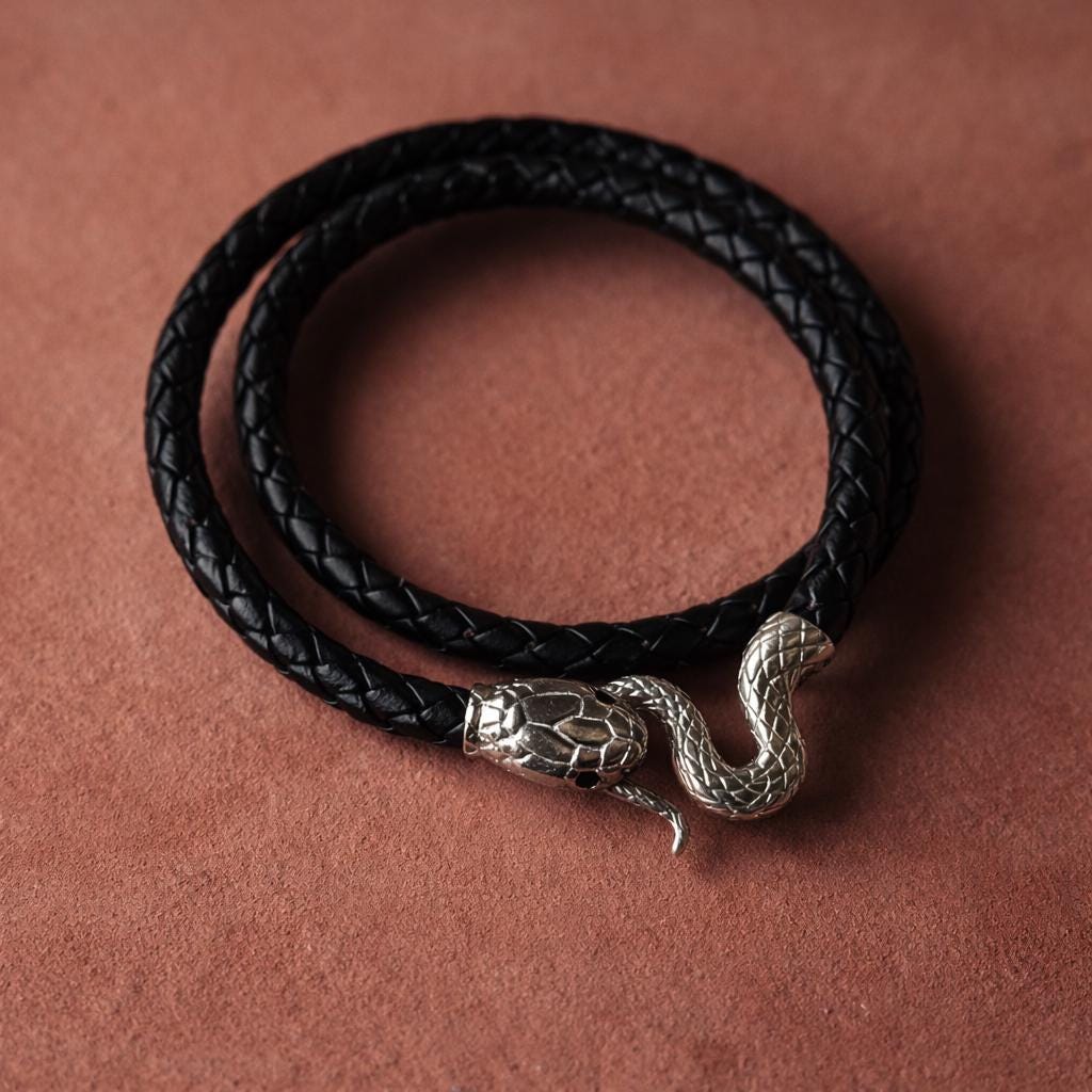 OUROBOROS is a necklace for men in 925 sterling silver and black leather imitation representing a snake biting its tail