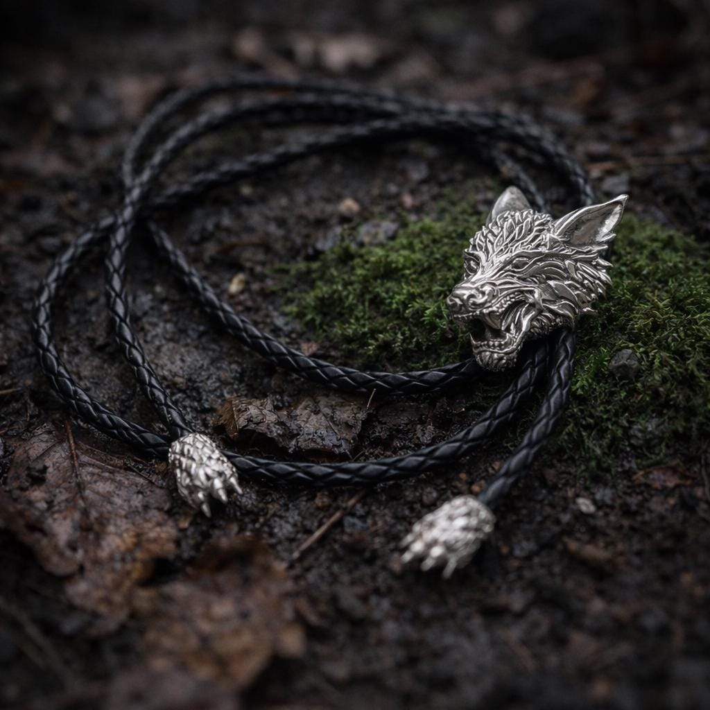 Unleash your wild instinct with LOUP ALFA, a handcrafted sterling silver 925 bolo tie featuring a sculpted wolf head and a black braided faux leather cord.