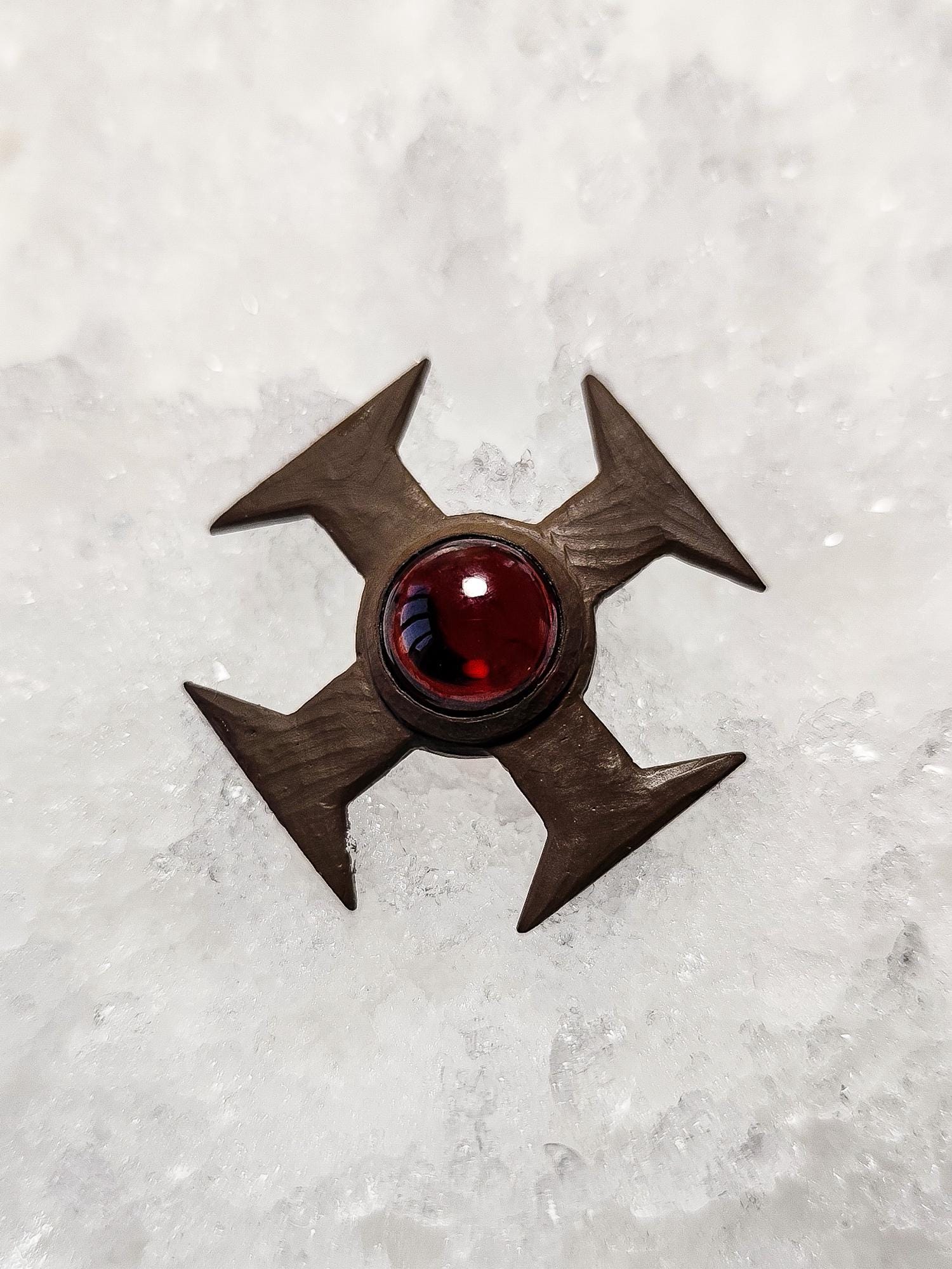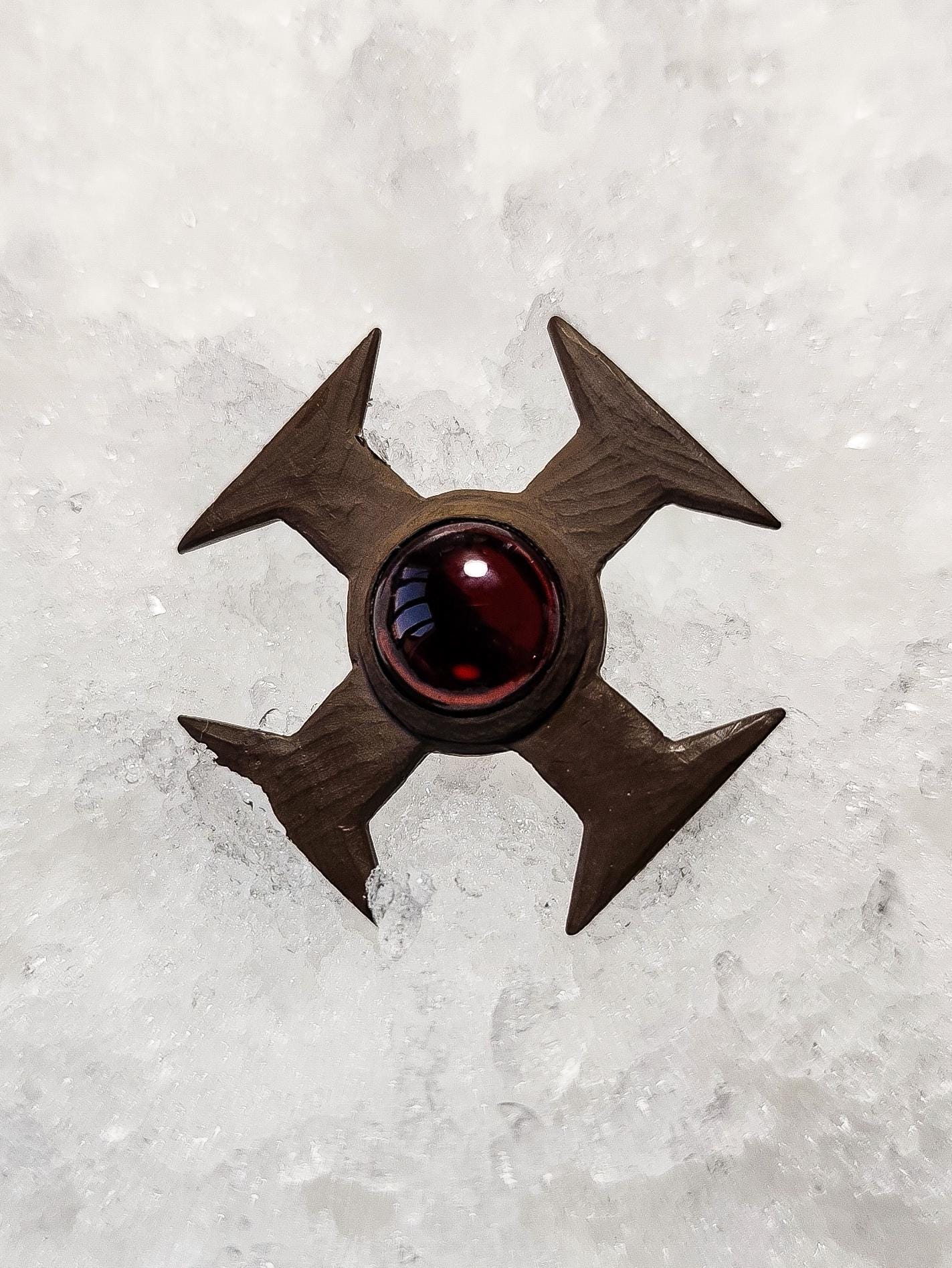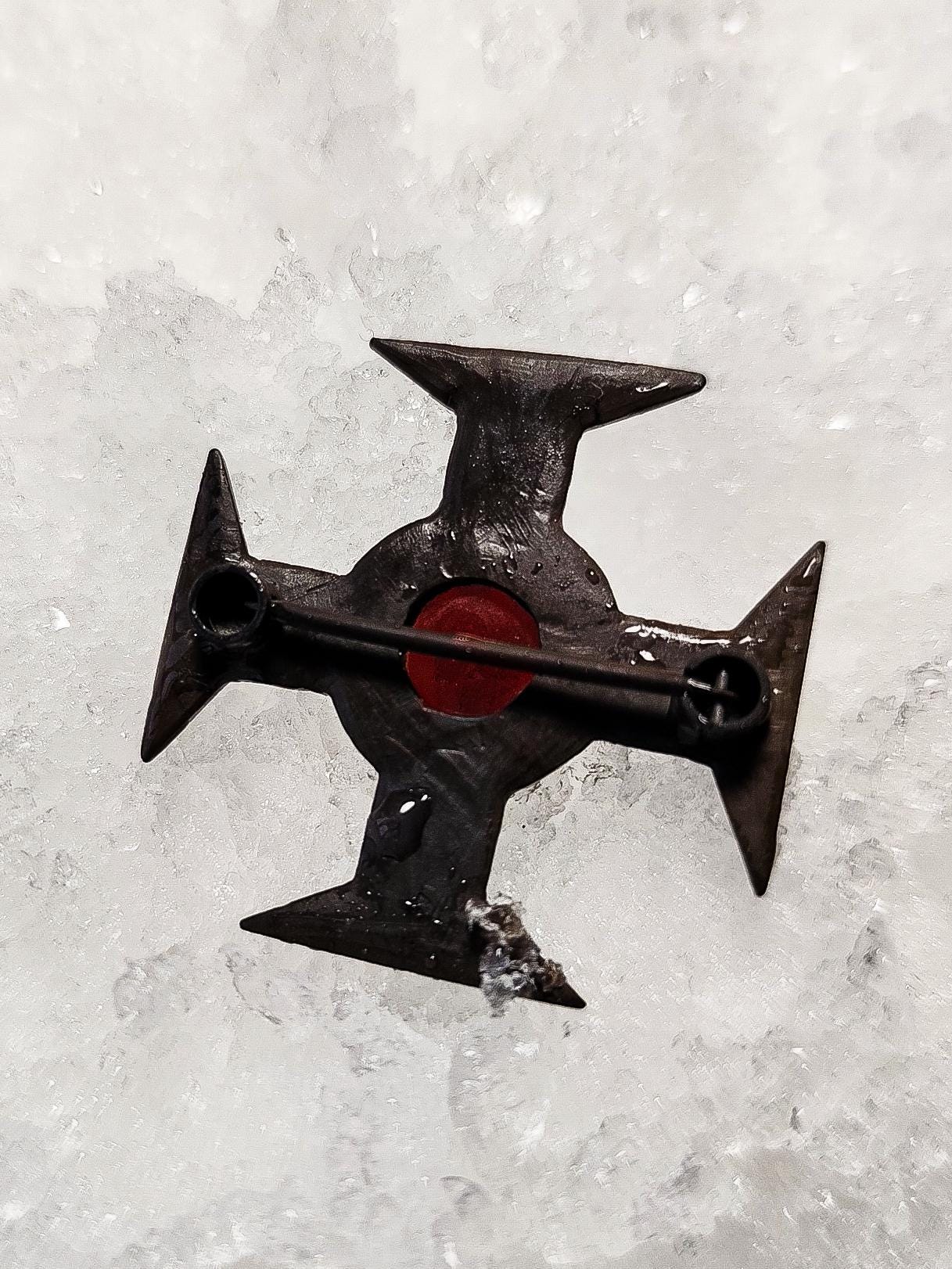 a solid, sculptural presence, crafted as a relic meant to be worn on a coat, jacket, or bag.