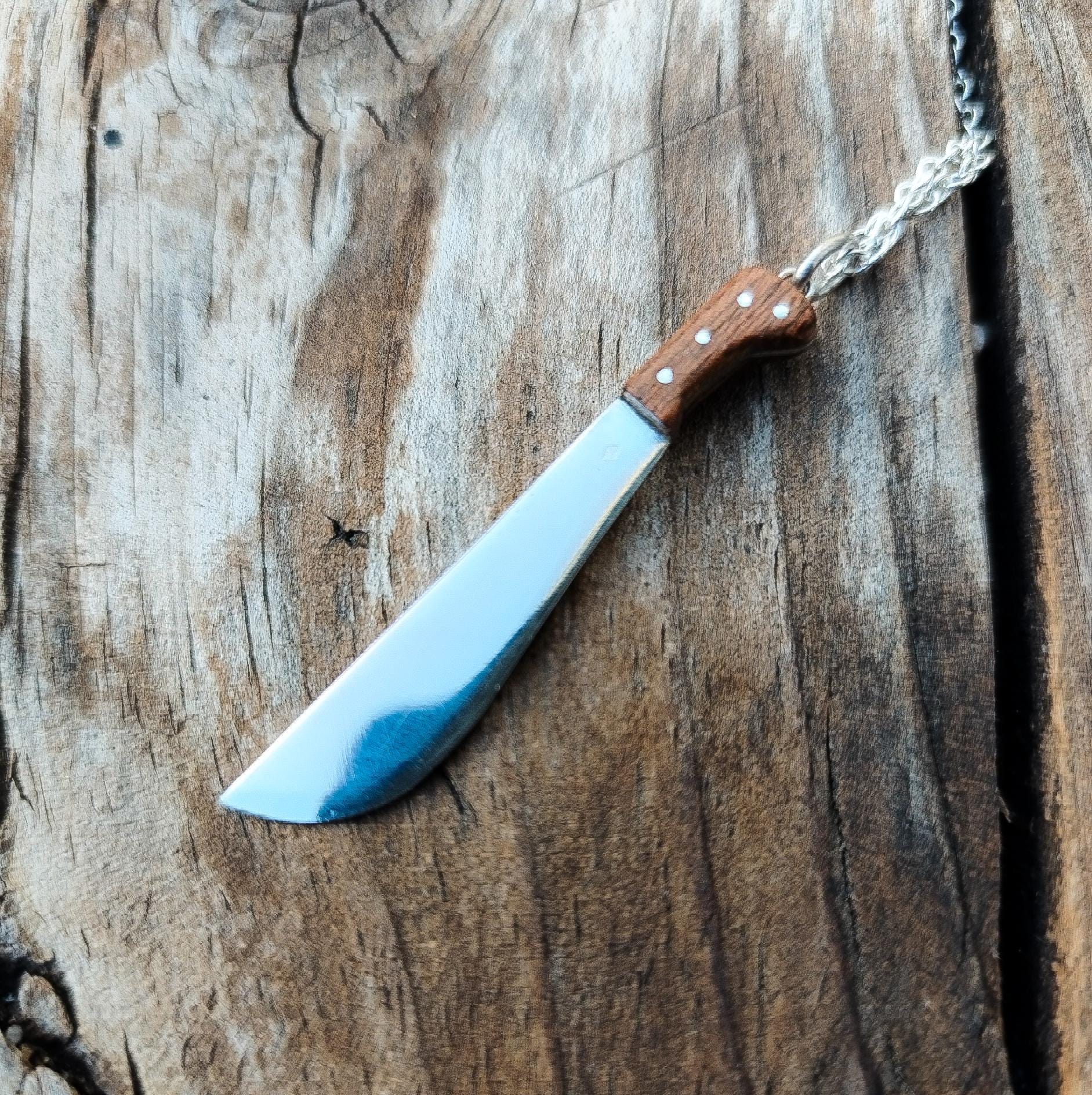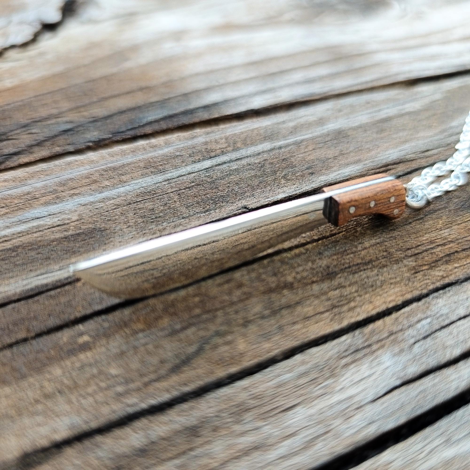 The handle, carved in mahogany wood, adds an authentic and realistic touch to this dark, iconic pendant.