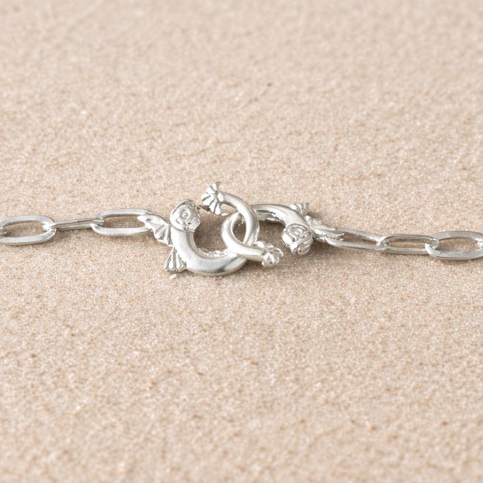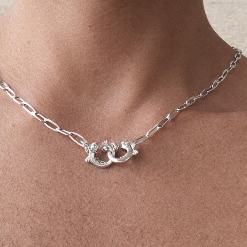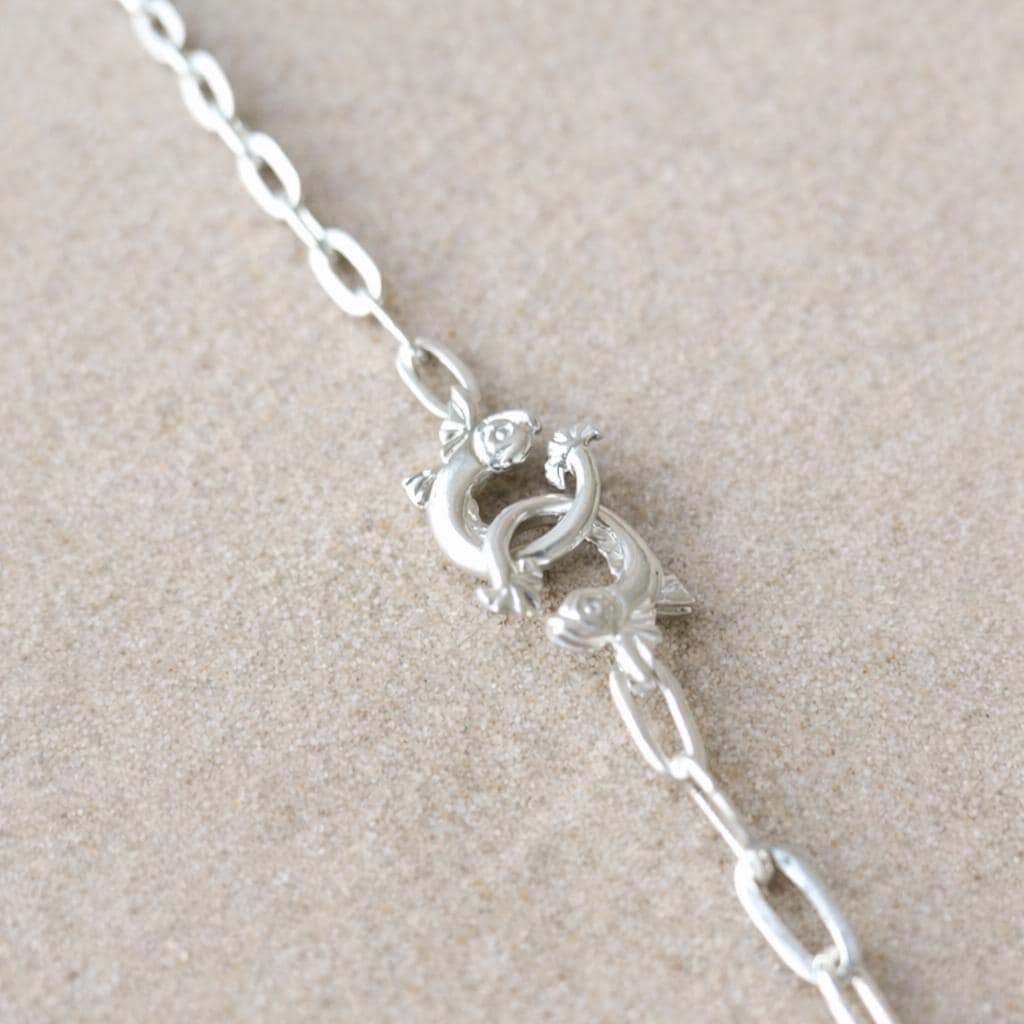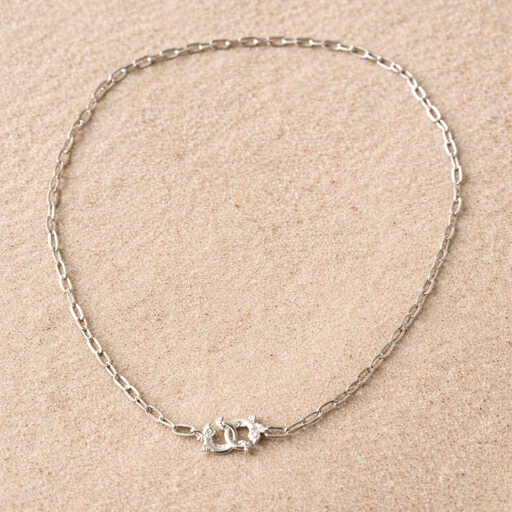 Its rectangular chain is highlighted by a sterling silver 925 clasp, featuring two antique-style dolphins locked together like a refined handcuff.