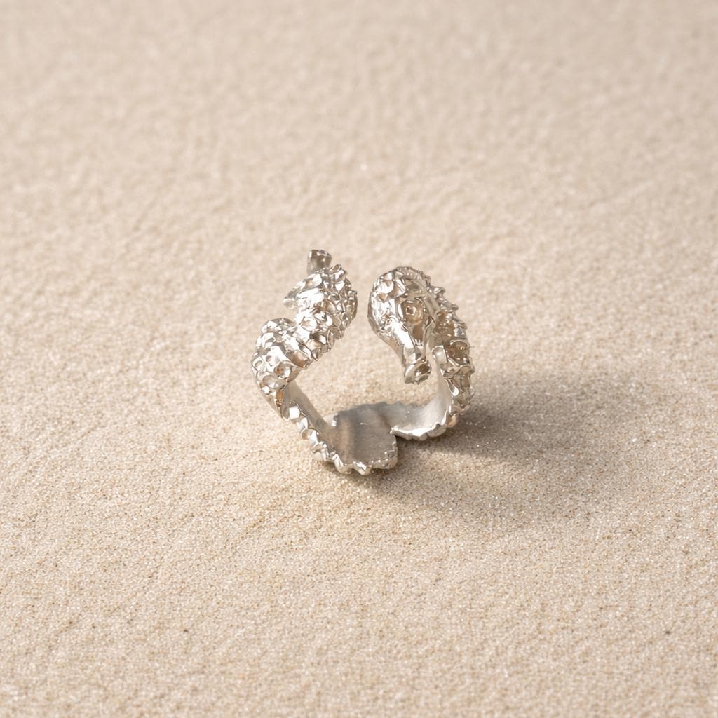"VALSE DES MERS is a handcrafted adjustable sterling silver men's ring, inspired by the myths and legends of seahorses. This ring is a work of art in its own right, where two intertwined seahorses gracefully rise around your finger, capturing the marine spirit.