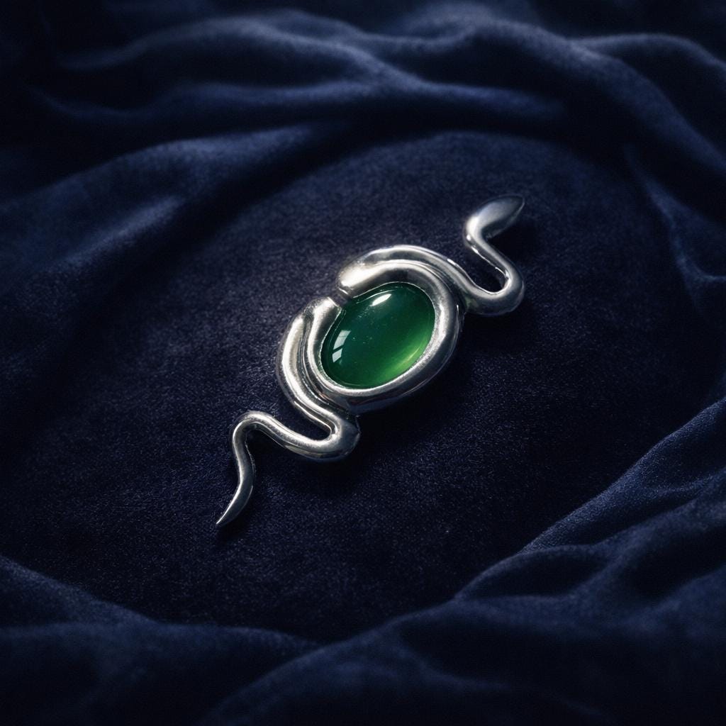 In Greek cosmogony, Eurynome, the Great Primordial Goddess, dances upon the chaos and shapes the universe with the help of the serpent Ophion. From their union emerges the Cosmic Egg, from which the heavens, the earth, and all forms of life are born. Inspired by this ancient legend, this sterling silver brooch depicts a serpent coiled around a green agate egg, a symbol of rebirth and connection to cosmic forces.