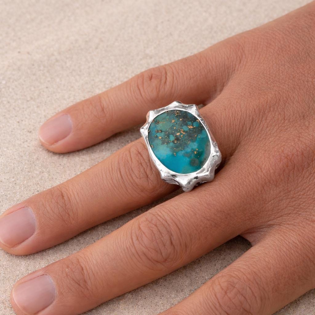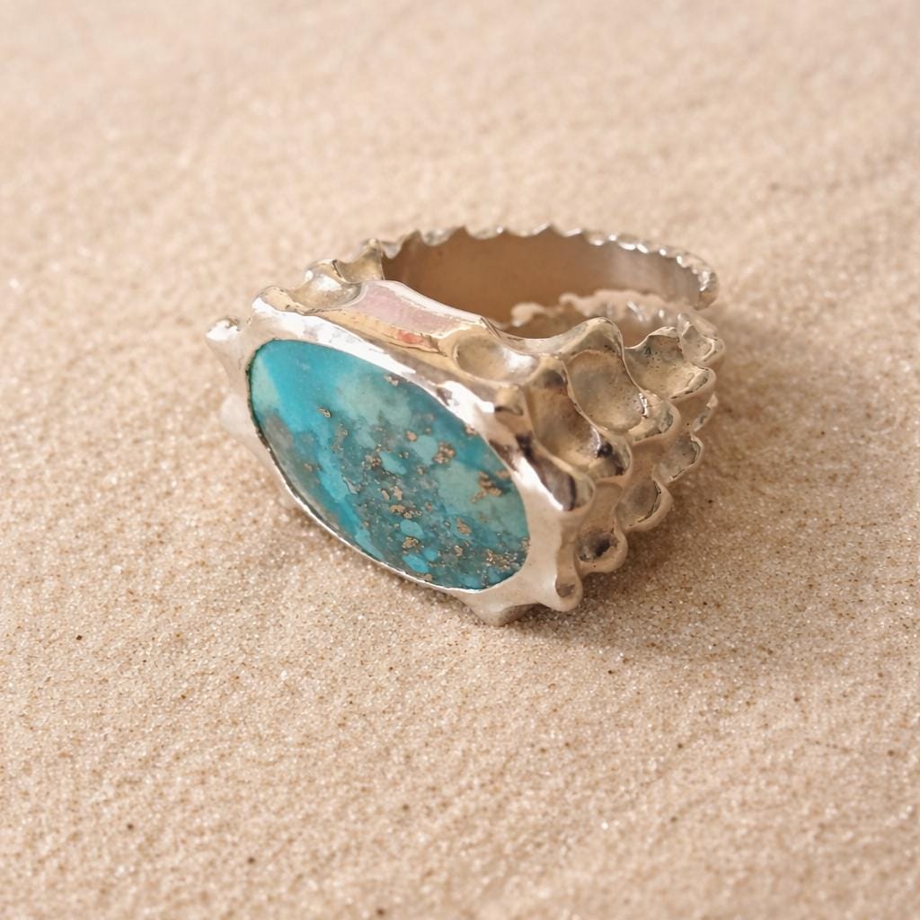 This unique piece elegantly combines sterling silver with the captivating beauty of turquoise, creating a fusion of land and sea.