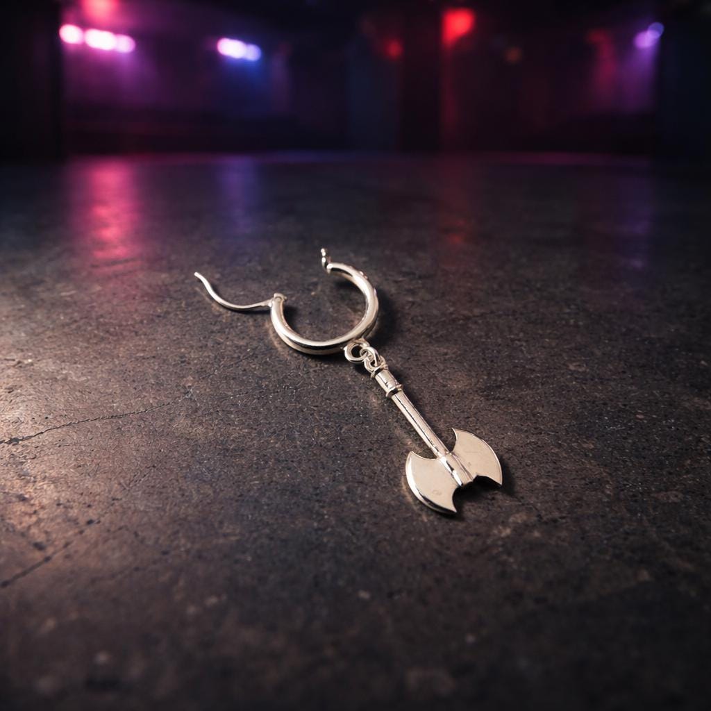 A sterling silver hoop earring, with a diameter of 12 mm, which features a double axe pendant measuring 20 mm.