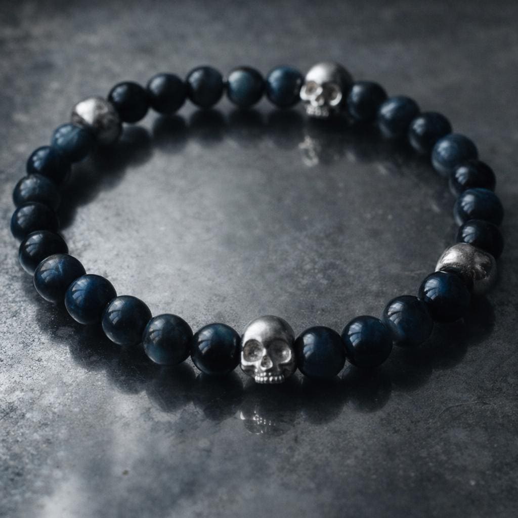 L’Œil et l’Éternel is a true talisman. This bracelet, crafted with Blue Tiger’s Eye stone and 925 sterling silver skulls, embodies protection, strength, and perseverance. A unique piece for those who dare to stand out while wearing an eternal symbol.