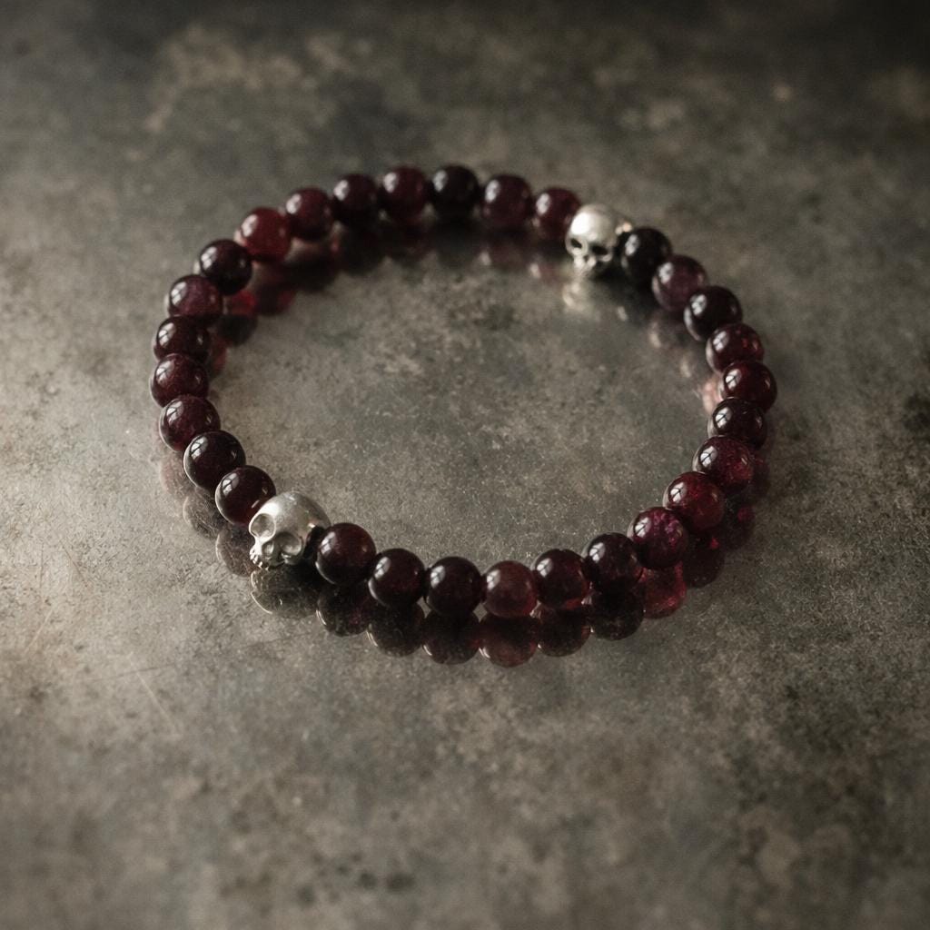 This piece combines deep red rhodolite garnet beads, tinged with rosy hues, with meticulously handcrafted sterling silver skulls.