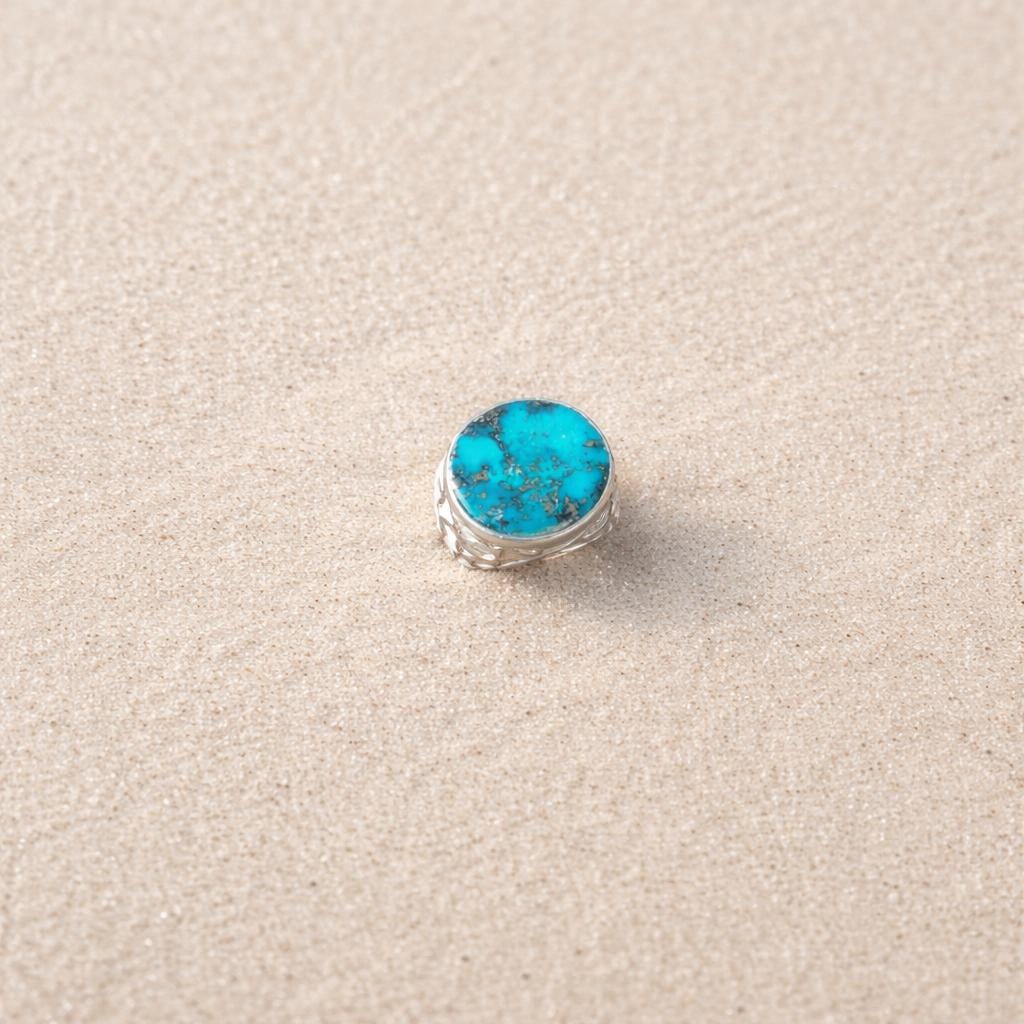 The turquoise, measuring an impressive 1.55 cm in height and 1.76 cm in width, showcases magical patterns and colors. To me, it evokes the sea, like a cove seen from above, inviting you to dive in.