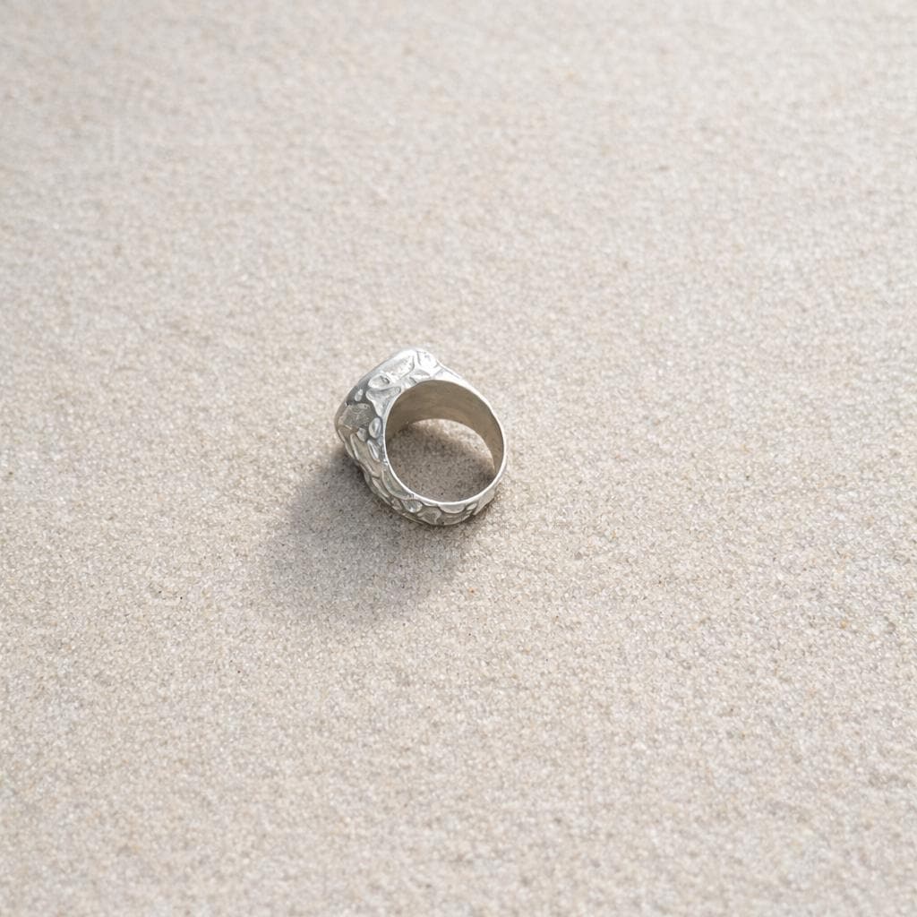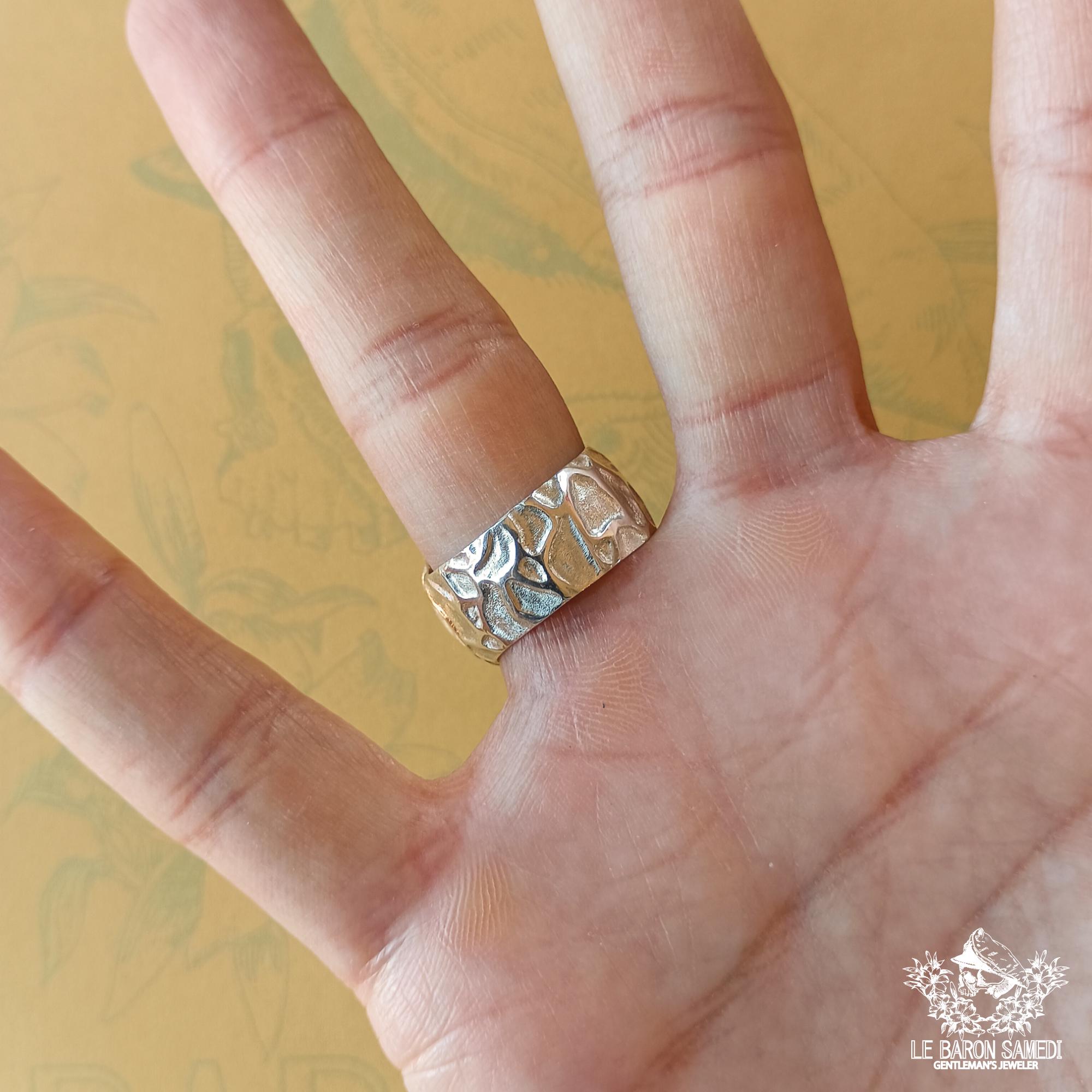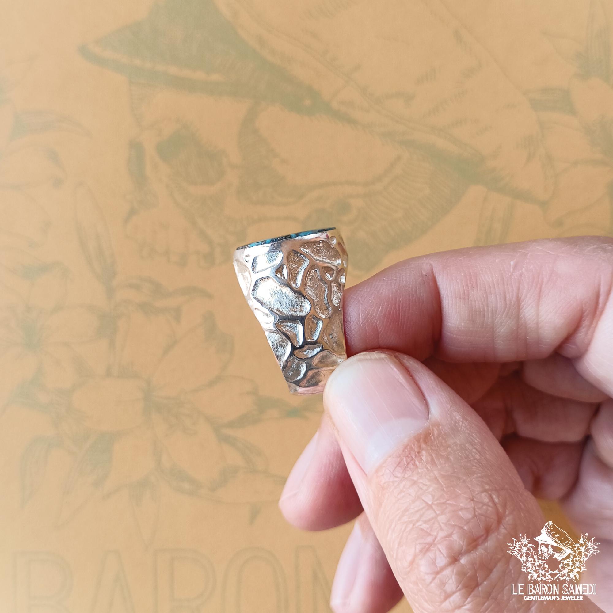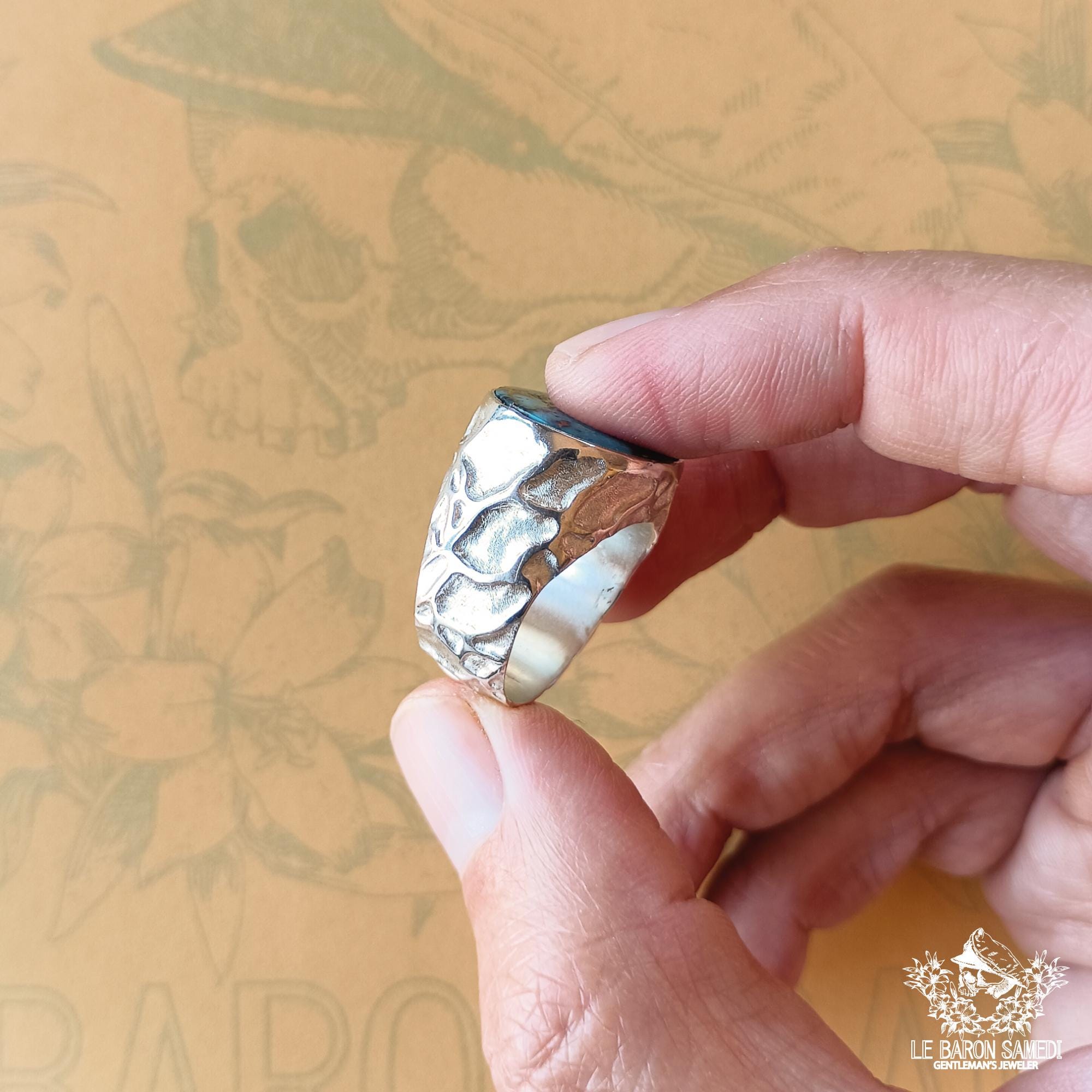 The ring's body is meticulously crafted with textures inspired by the reflections of water, reminiscent of those dancing on a boat's hull. It weighs about 17g, offering both robustness and elegance.