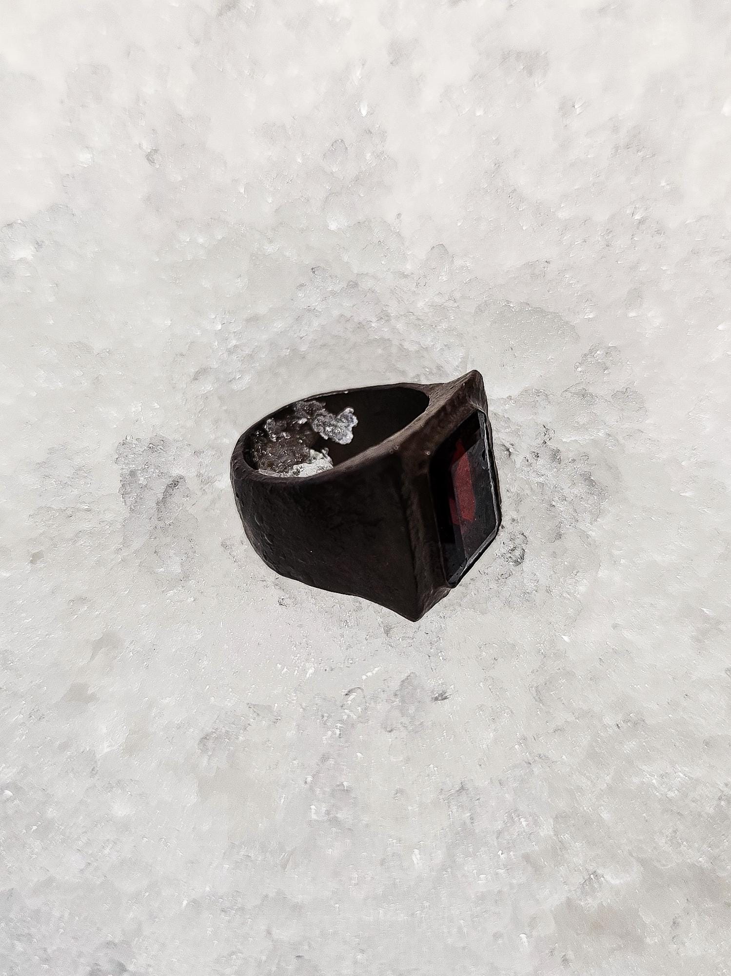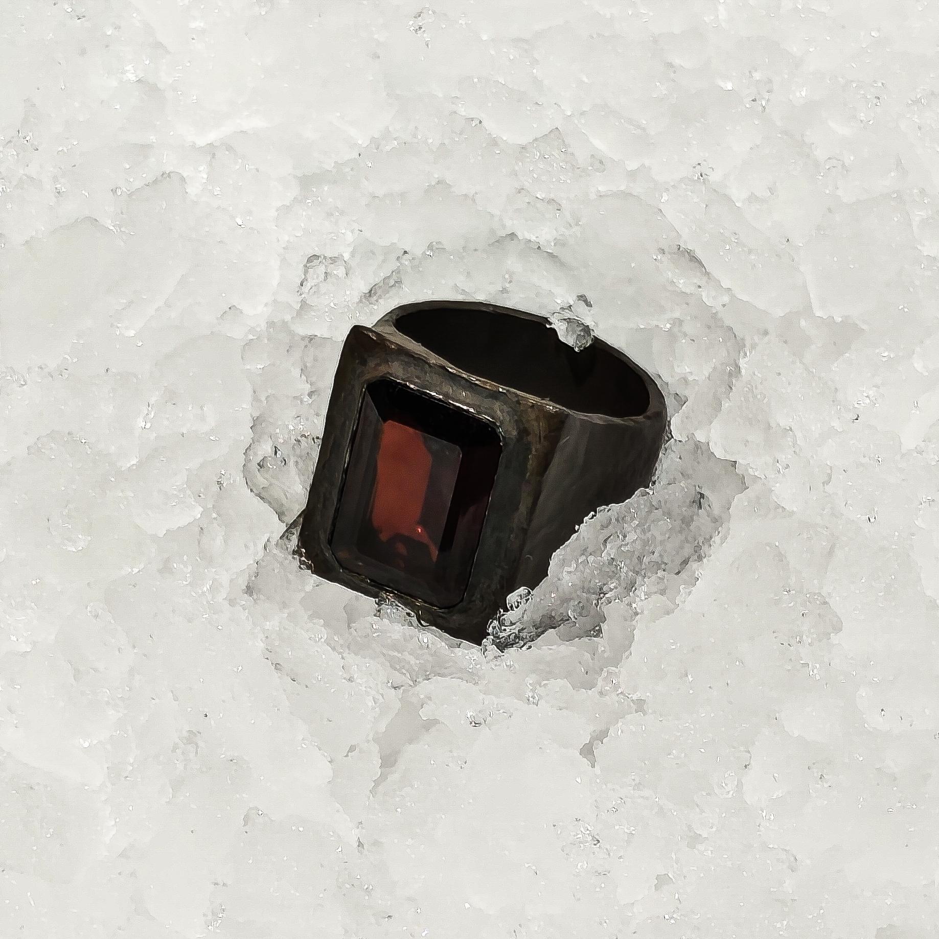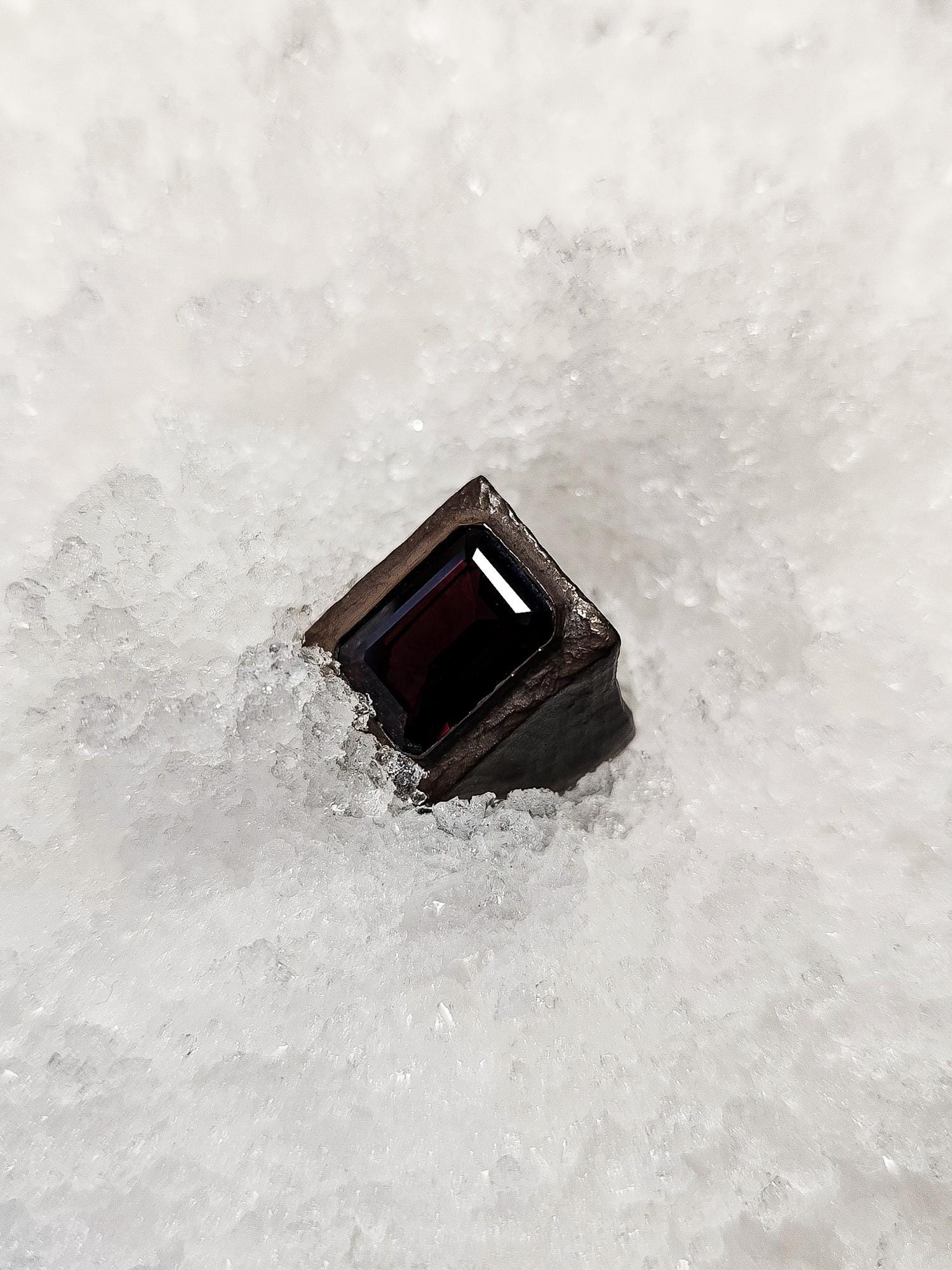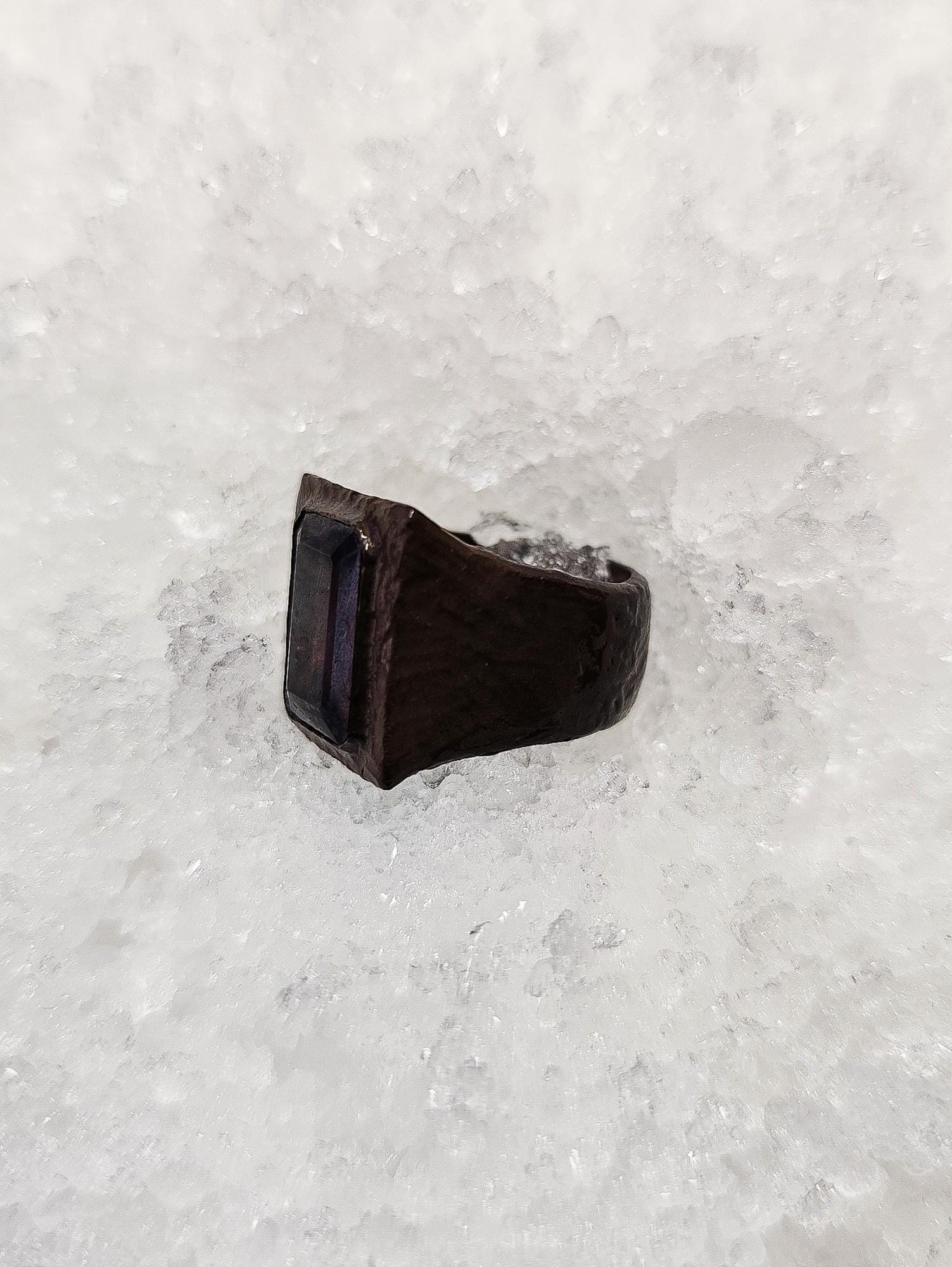 a heavy, rectangular piece of blackened 925 sterling silver, almost runic in appearance, centered around an octagon-cut stone measuring 14 × 10 mm (approx. 8.2 carats), hand-set in your workshop.