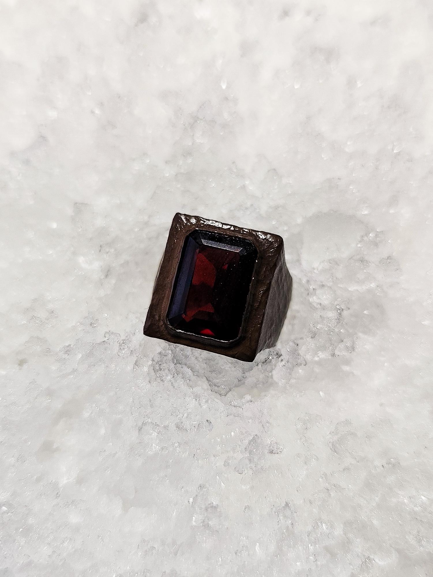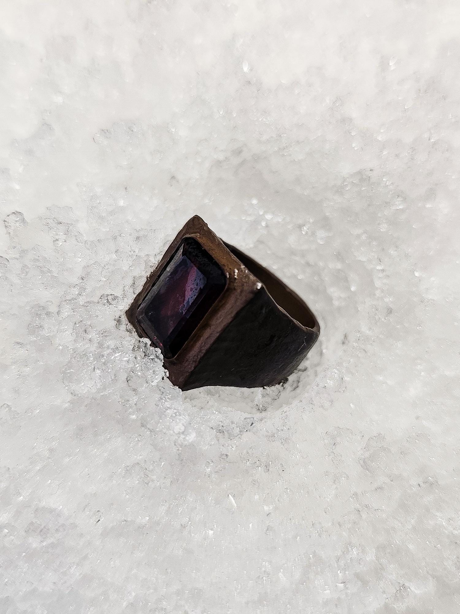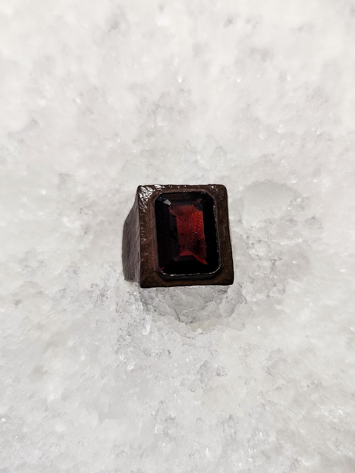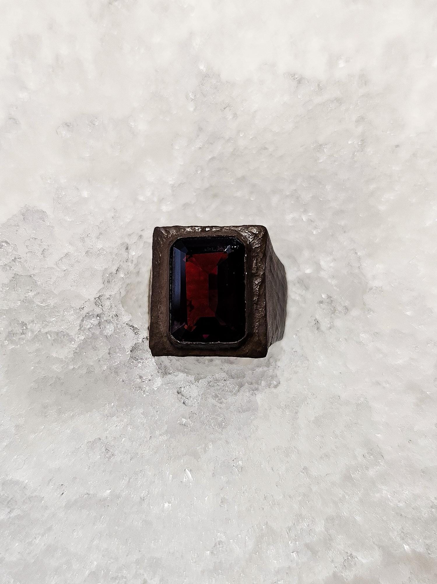 a heavy, rectangular piece of blackened 925 sterling silver, almost runic in appearance, centered around an octagon-cut stone measuring 14 × 10 mm (approx. 8.2 carats), hand-set in your workshop.
