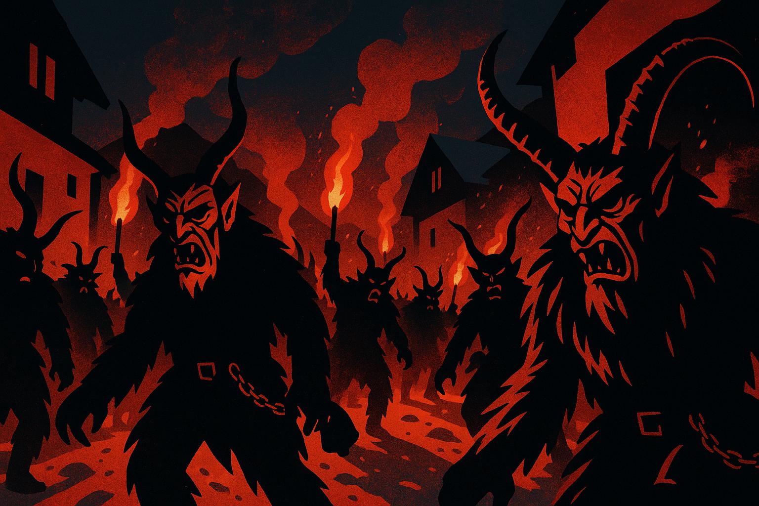 Aujourd’hui encore, dans les villages autrichiens, bavarois, slovènes ou tyroliens, les rues s’embrasent chaque début décembre lors des Krampuslauf : défilés nocturnes où des dizaines de Krampus, masqués, cornués, hurlants, parcourent les rues.